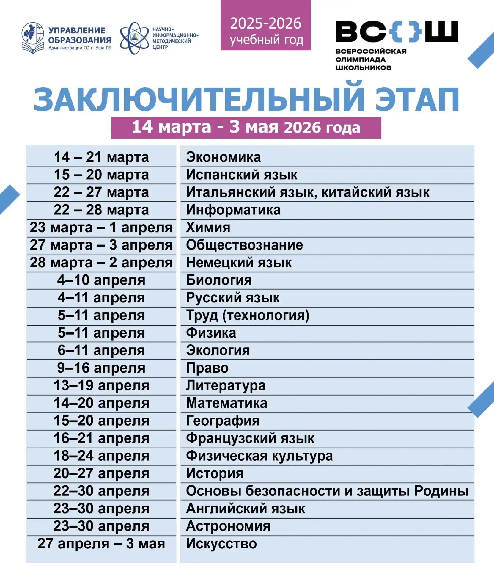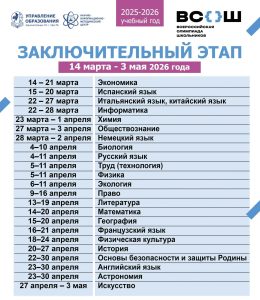 С 14 марта по 3 мая пройдёт финал (заключительный этап) всероссийской олимпиады школьников 2025–2026 учебного года. Сроки и места проведения заключительного этапа всероссийской олимпиады школьников в 2025/26 учебном году: