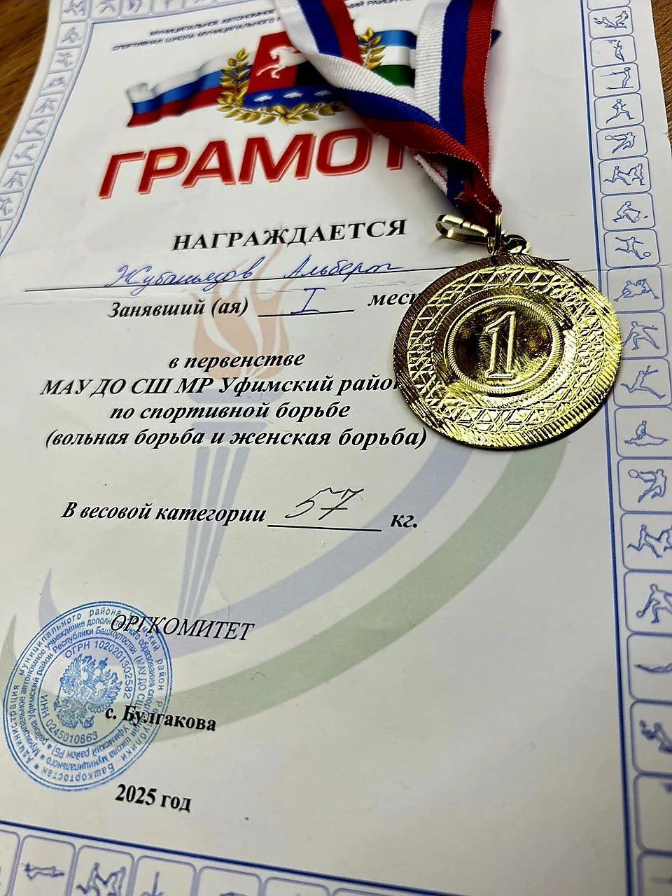 23 декабря 2025 года ученик 9 «А» класса МАОУ «Школа №45 с углублённым изучением отдельных предметов» Жубаньязов Альберт Азатович принял участие в Первенстве МАУ ДО СШ МР Уфимский Район по спортивной борьбе среди юношей 2009 — 2010 г.р. в дисциплине «Вольная Борьба» и занял почётное I место, доказав в очередной раз, что он лучший в своей весовой категории.